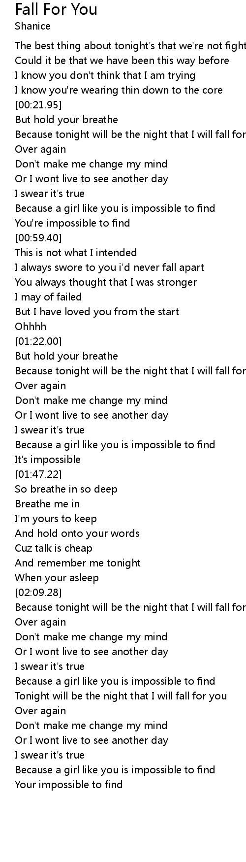 Fall For You Lyrics : The Raging Nathans I Could Never Fall In Love With You Lyrics Genius Lyrics. Here we stand or here we fall history won't care at all make the bed, light the light, yeah lady mercy won't be home tonight, yeah (you don't waste no time at all) don't hear the bell but you answer the call (it comes to you as to us all) yeah, we're just waiting for the hammer to fall, yeah oh, every night and every day a little piece of you. chorus money fall on you banana fall on you prada fall on you 'cause i'm in love with you, ehh money fall on you banana fall on you paparazzi follow you 'cause i'm in love with. Music video by chris tomlin performing we fall down. (c) 2015 sixstepsrecords/sparrow records#christomlin #wefalldown #vevo #christian #vevoofficial Jan 21, 2008 · verse 2 this is not what i intended i always swore to you i'd never fall apart you always thought that i was stronger i may have failed, but i have loved you from the start chorus 2 oh, but.